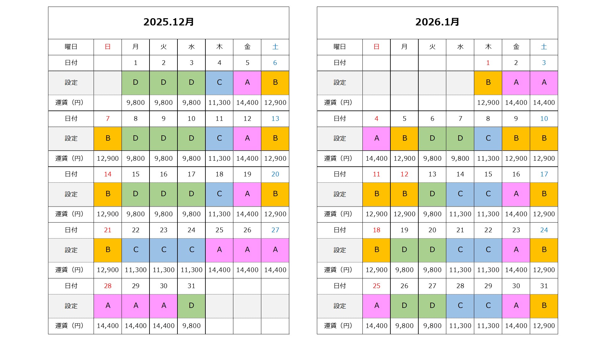 - 小児運賃および障がい者運賃(大人)は全日7,200円となります。